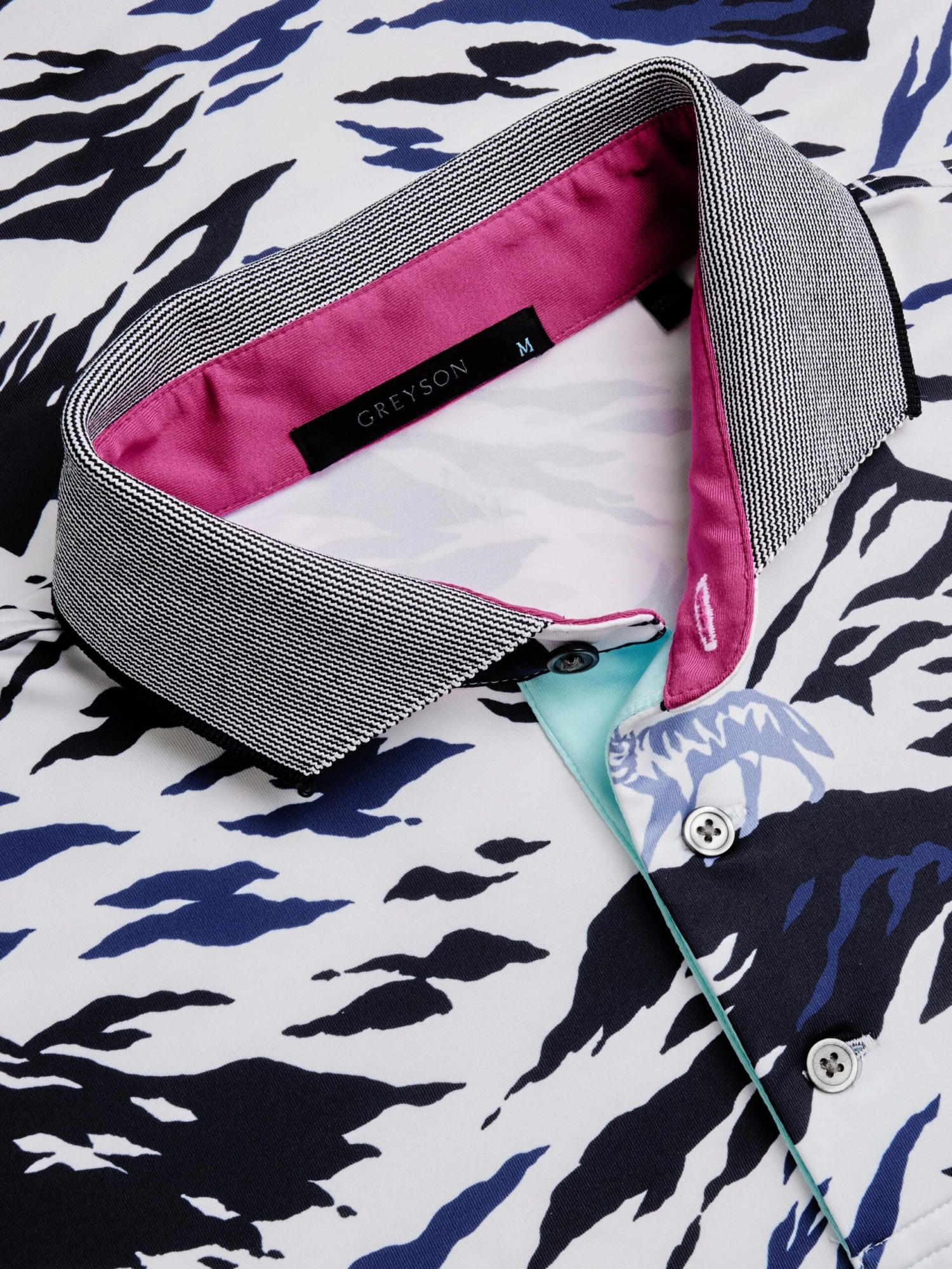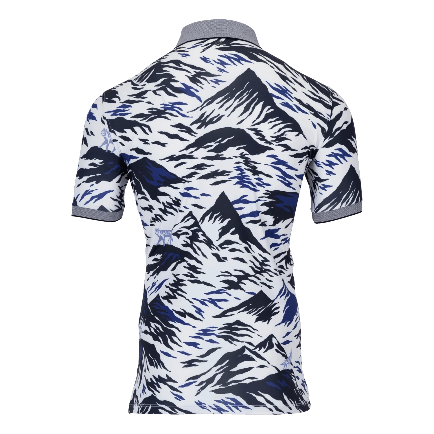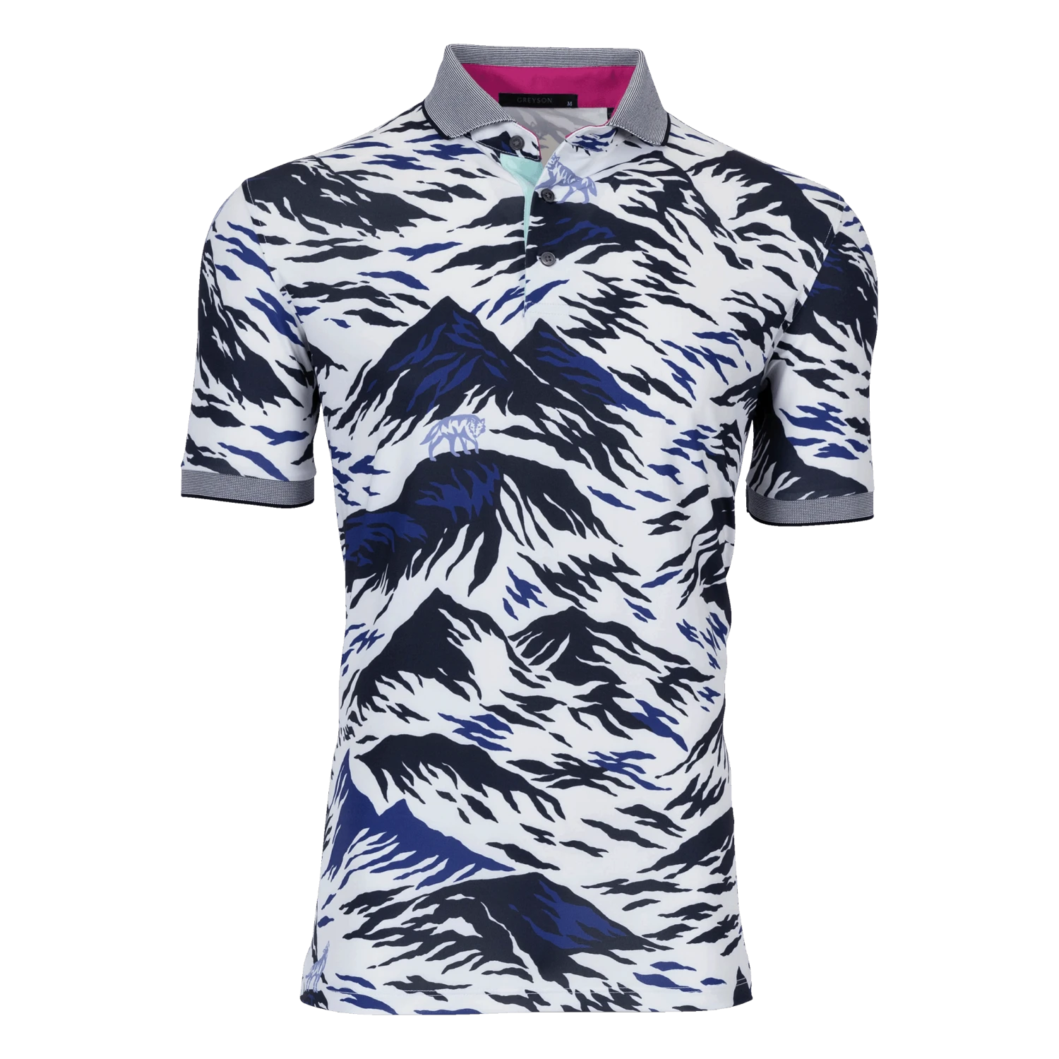 Constructed for superior performance, this printed polo delivers elevated comfort and freedom of movement on and off the golf course. Designed with a unique mountain landscape, this unique polo features a striking pattern throughout. Finished with a knit collar and a three-button placket.