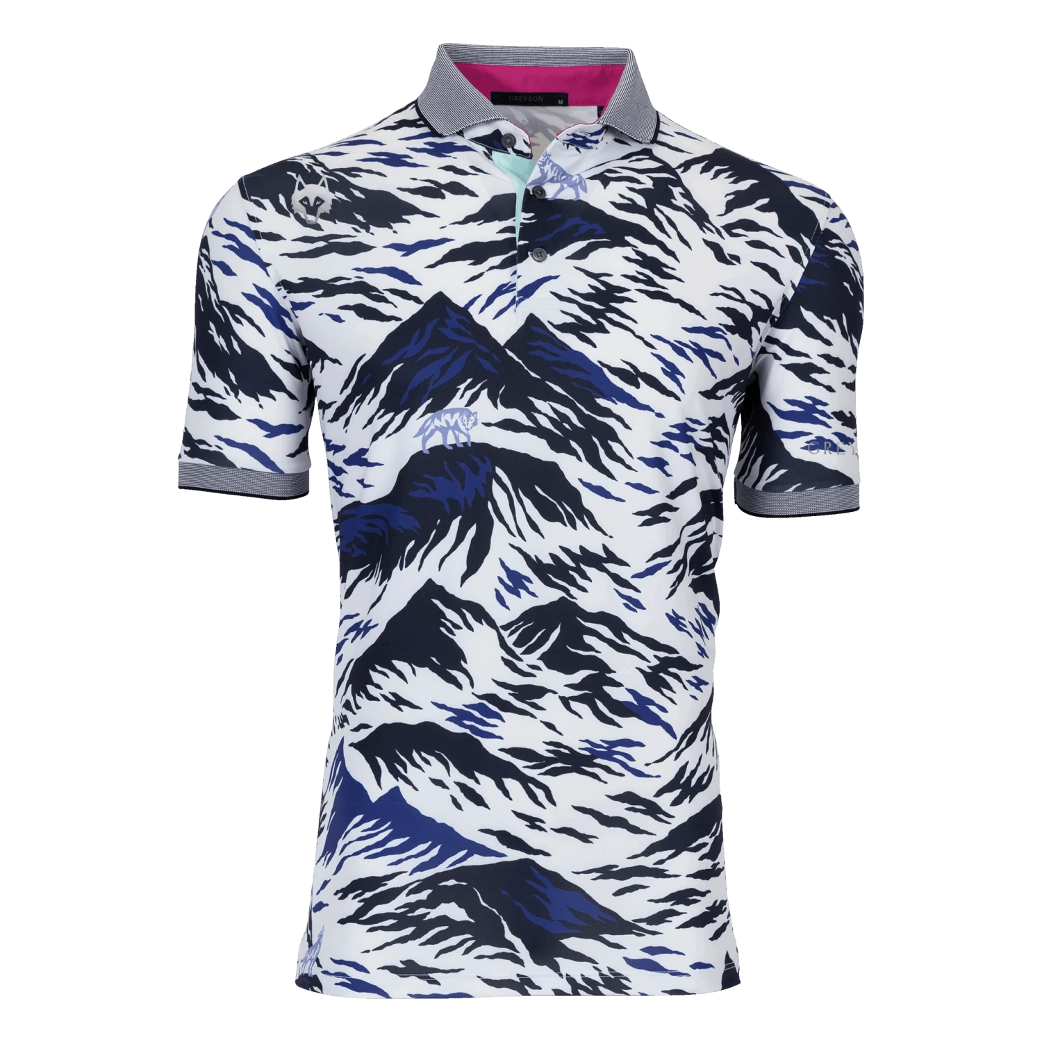 Now available with our tour logos, this printed polo delivers elevated comfort and freedom of movement on and off the golf course. Designed with a unique mountain landscape, this unique polo features a striking pattern throughout. Finished with a knit collar and a three-button placket.
