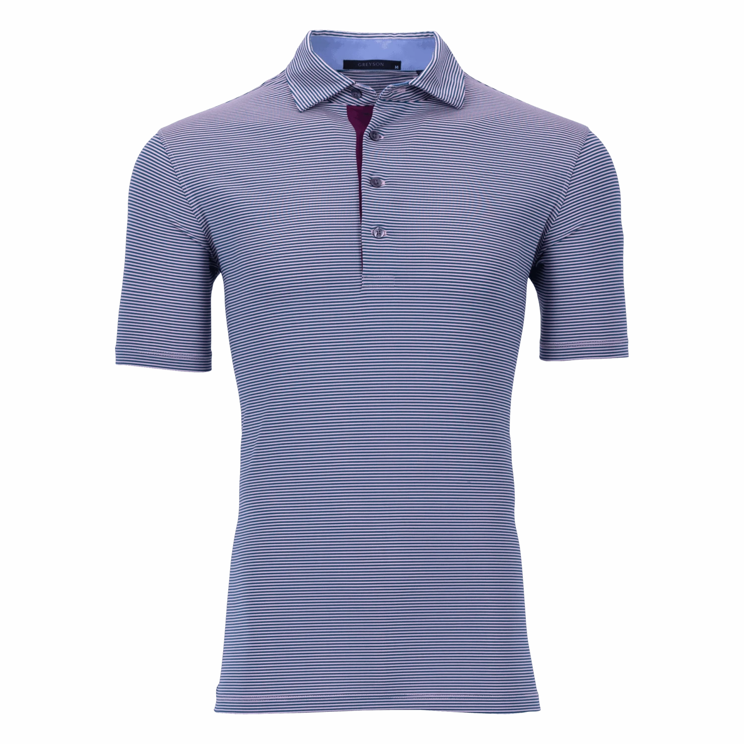A classic stripe that transitions effortlessly from the golf course to every part of your lifestyle. Constructed with a blend of polyester and spandex fabric, the Saranac is finished with a sateen wash creating a silky hand. This mini feed striped polo features a four button placket with a pop of color on the neck and placket.
