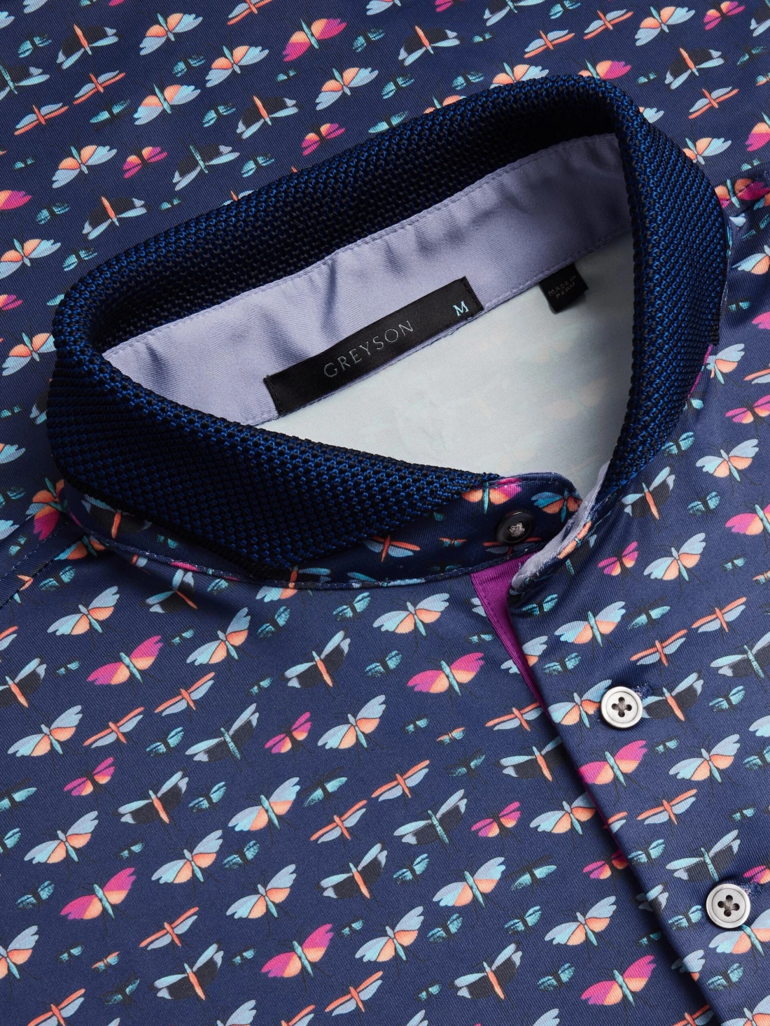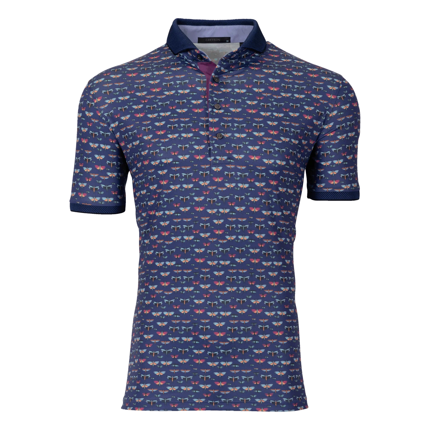 Designed with a one-of-a-kind pattern, this elevated polo boasts a beautiful palette in a performance-driven polo. Antimicrobial and designed with plenty of stretch. Finished with a jacquard knit collar with contrast tipping and banded sleeves.
