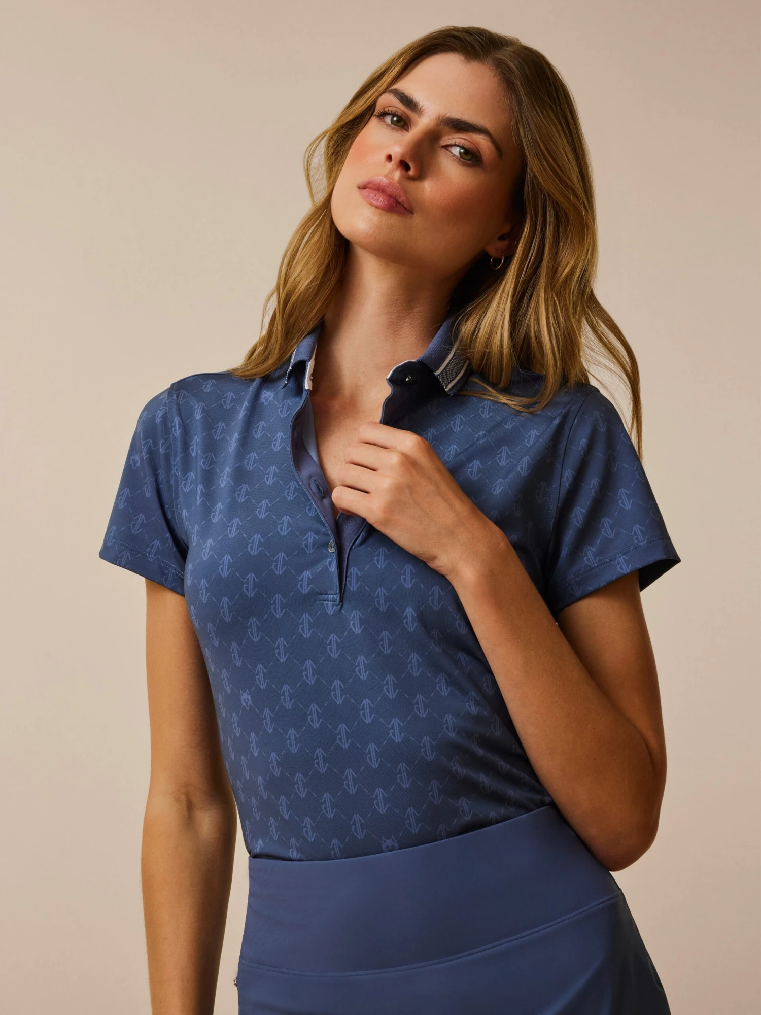 The Wolf Links Scarlett Polo is designed with a slim, athletic fit to deliver high performance on and off the golf course. Constructed with a luxurious lightweight fabric for breathability, this versatile polo features the signature Wolf Links print throughout. It has a round collar and the Greyson wolf head on the bottom right. This top is finished with a four-button placket.